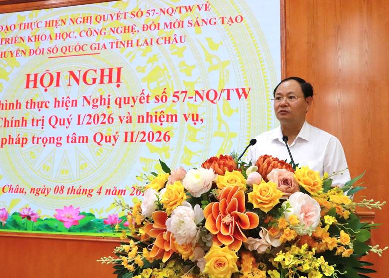 Sáng ngày (8/4), Ban Chỉ đạo thực hiện Nghị quyết số 57-NQ/TW về đột phá phát triển khoa học, công nghệ, đổi mới sáng tạo và chuyển đổi số quốc gia tỉnh Lai Châu (Ban Chỉ đạo Nghị quyết số 57-NQ/TW tỉnh) tổ chức Hội nghị Đánh giá tình hình thực hiện Nghị quyết số 57-NQ/TW của Bộ Chính trị Quý I/2026 và nhiệm vụ giải pháp trọng tâm Quý II/2026. Hội nghị được tổ chức theo hình thức trực tiếp kết hợp trực tuyến từ điểm cầu tỉnh kết nối đến điểm cầu 38 xã, phường trong tỉnh. Đồng chí Lê Minh Ngân - Ủy viên Ban Chấp hành Trung ương Đảng, Bí thư Tỉnh ủy, Chủ tịch HĐND tỉnh, Trưởng Ban Chỉ đạo Nghị quyết số 57-NQ/TW tỉnh chủ trì Hội nghị.
