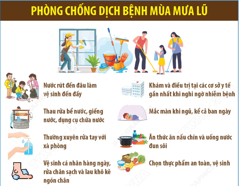 Có rất nhiều biện pháp phòng chống dịch bệnh mùa mưa lũ, trong số đó phải kể đến các biện pháp như: Nước rút đến đâu làm vệ sinh đến đấy; thau rửa bể nước, giếng nước, dụng cụ chứa nước; thường xuyên rửa tay với xà phòng; vệ sinh cá nhân hàng ngày, rửa chân sạch và lau khô kẽ ngón chân; tiêu diệt loăng quăng/bọ gậy, diệt muỗi…